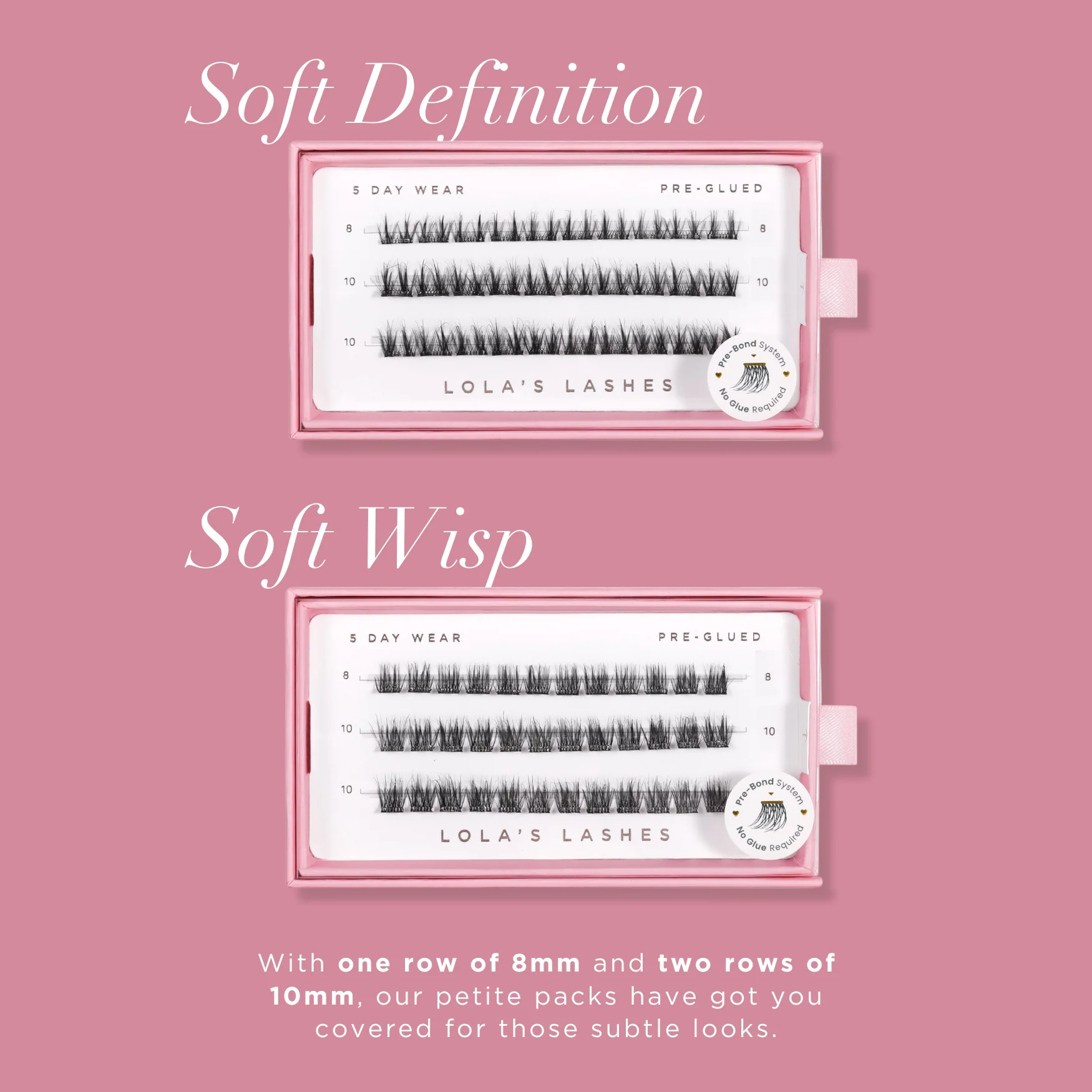 Discover the gentle allure of our Soft Wisp Petite Packs, crafted to deliver an effortlessly soft and airy look. With 1 row of 8mm and 2 rows of 10mm lashes, they provide a delicate, fluttery accent for those who prefer a subtle enhancement that feels light and natural.
